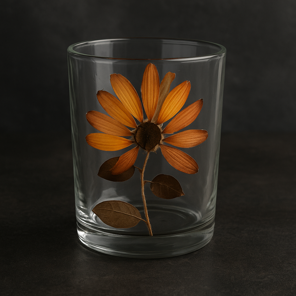Copo de Vidro Artesanal Gerbera 300ml com Folhas Naturais