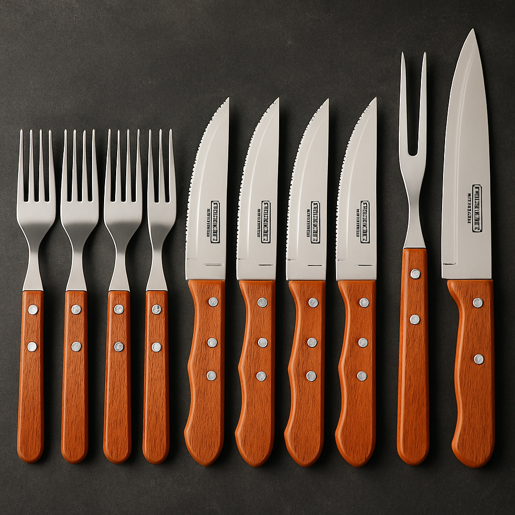 - Conteúdo do conjunto: 4 facas jumbo para churrasco, 4 garfos jumbo, 1 faca para carne, 1 garfo trinchante